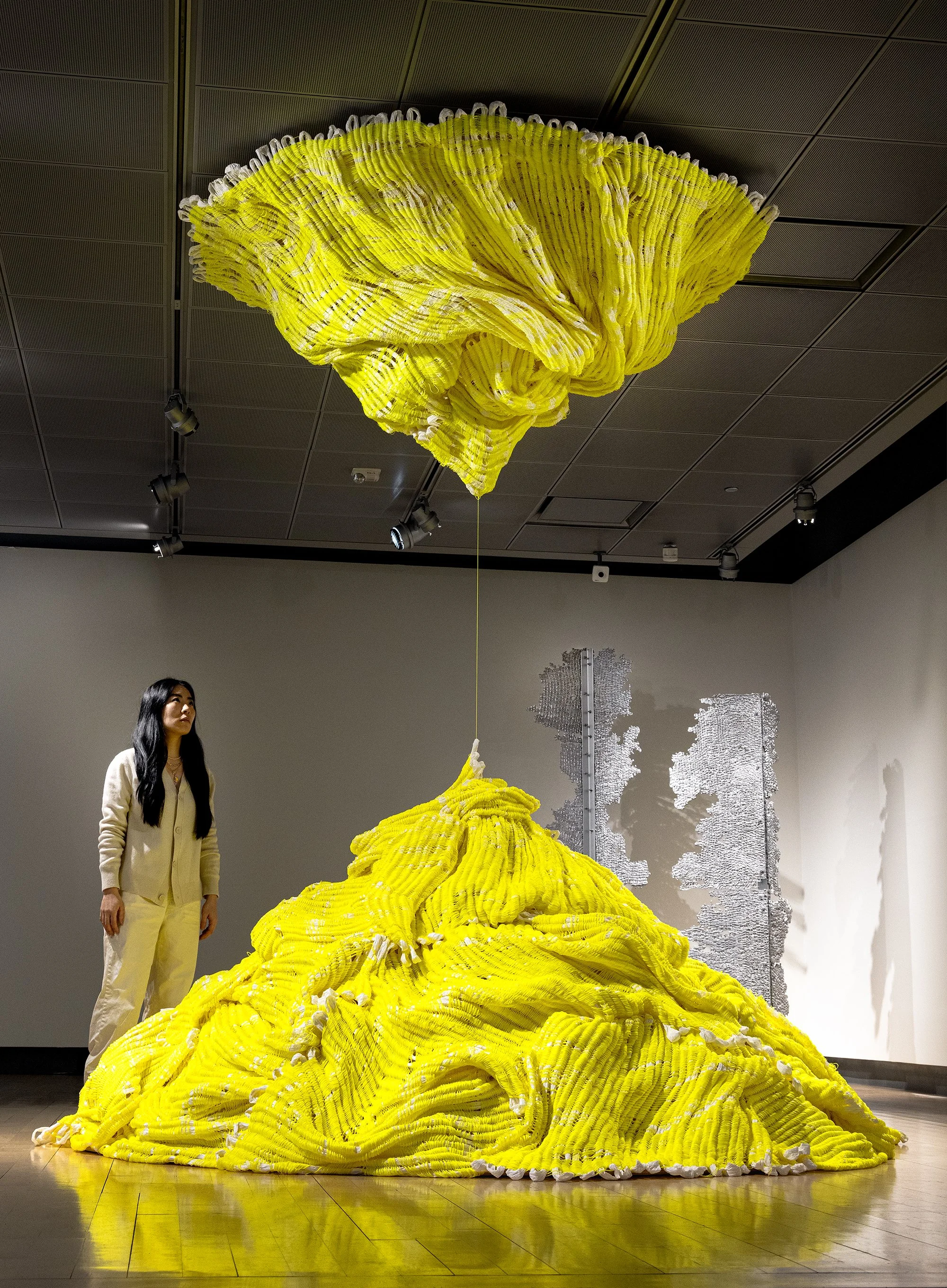 The loom serves as the foundation of Jung's frameworks, enabling a material exploration beyond visual and tactile experiences. Central to her practice is a methodical, intentional, and labor-intensive process, where the creation of each piece allows critical assessment and deliberate shaping. Tangible evidence of this process invites viewers to slow down and engage deliberately, fostering prolonged moments of reflective observation and immersive engagement with the work's overall form and structure.