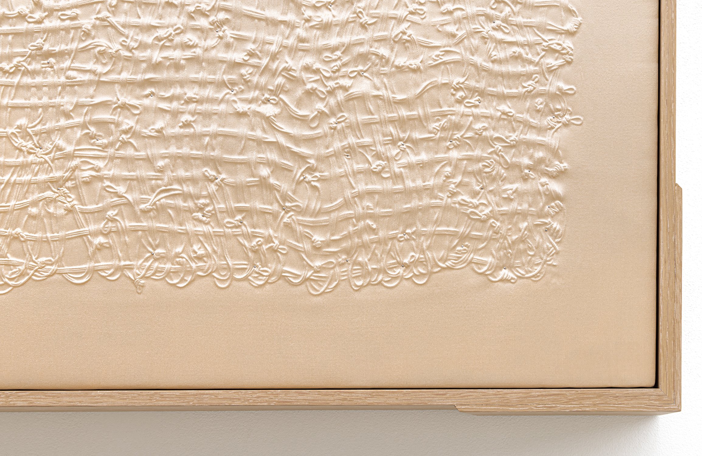 Silk, archival tyvek, foam, stainless steel hardware and white oak