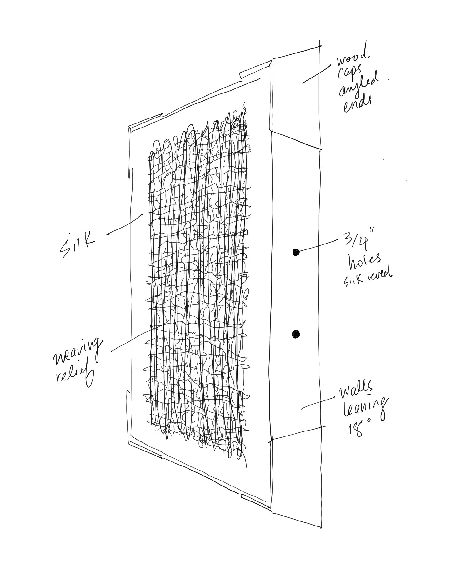 As light moves across the silk, highlights and shadows move across the impressions, giving the work an evolving presence throughout the day.