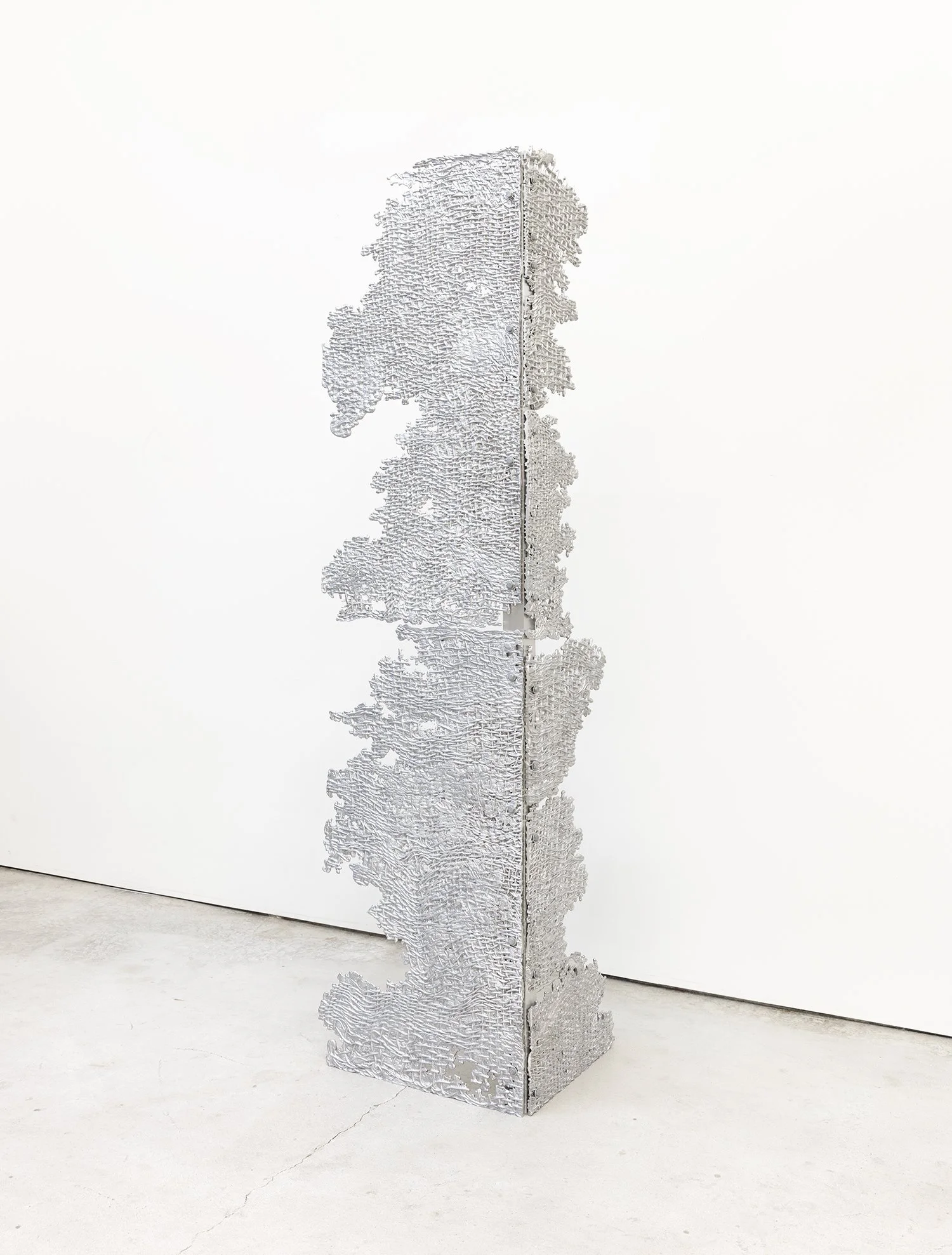 Fragmented Pillar A stands as a towering sculpture reminiscent of a fractured column. Its sand-cast surface, accented by exposed bolts, draws upon architectural language, evoking the resilience of built structures while revealing the vulnerability of their decay. Stemming from the loom, the cast aluminum captures the woven form's structural imprint, emphasizing both presence and absence through its fragmented edges and voids. Through these elements, Fragmented Pillar A prompts contemplation of the boundaries we create and the passage of time, highlighting the fluid interplay between stability and fragility.