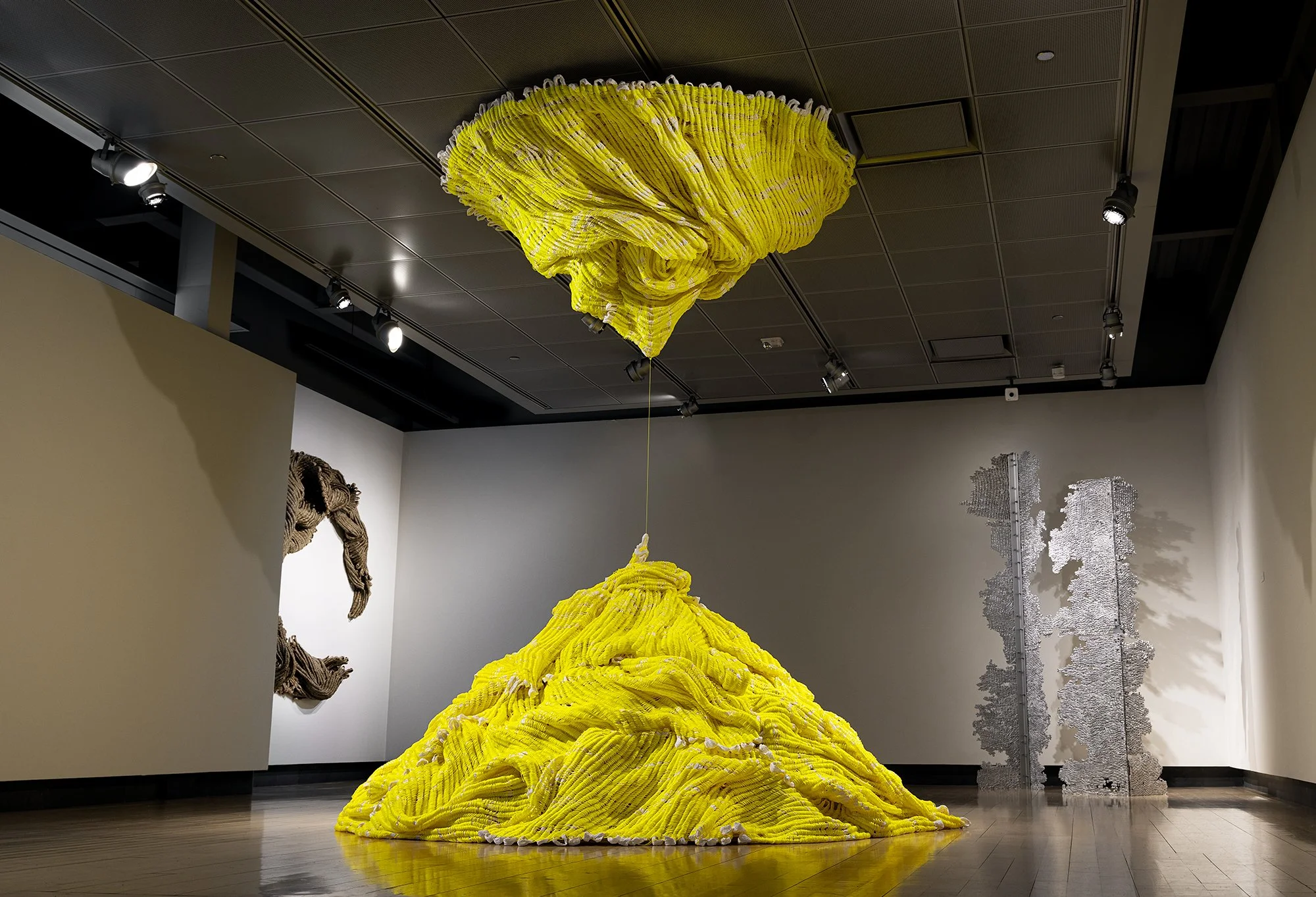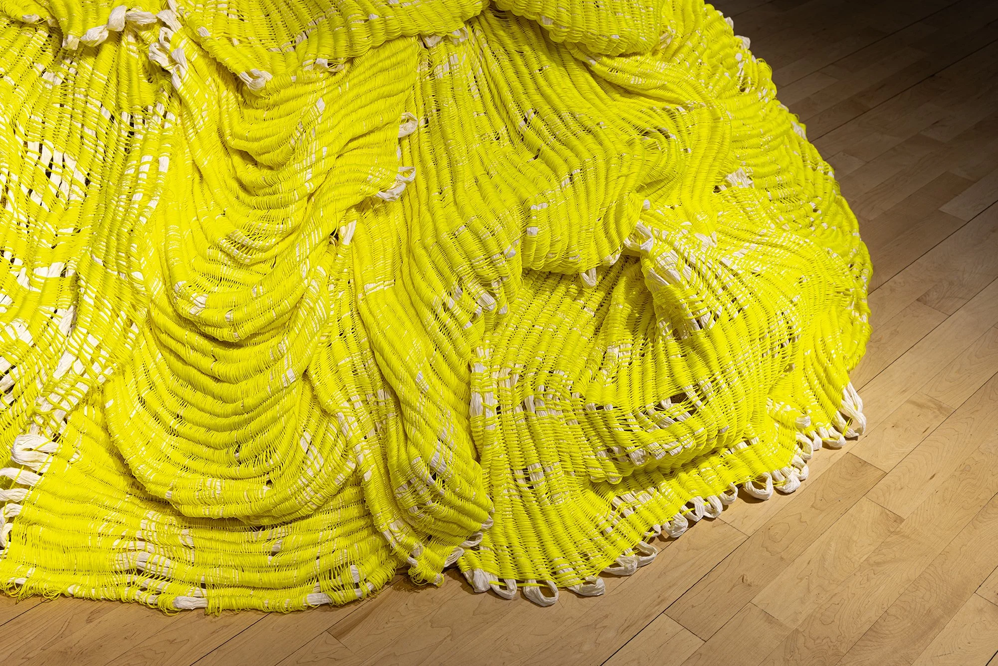 Resonate With emerges from the Fallen Fence series, continuing my exploration of spaces for contemplation—where change and transformation can unfold. A large mass anchors the floor, its base broad and heavy, piling upward and tapering to a single point at the top, while the form at the top mirrors the bottom, suspended from the ceiling. The two forms are connected by a single strand that weaves through the entire composition. The undulating shapes convey a sense of movement—ascending, descending, or poised in between—leaving their trajectory open to interpretation. The woven surface’s imperfections and the irregular creases in the paper highlight the rigor of the hand’s presence, drawing the viewer into the layered structure and inviting a continual reevaluation of perception.